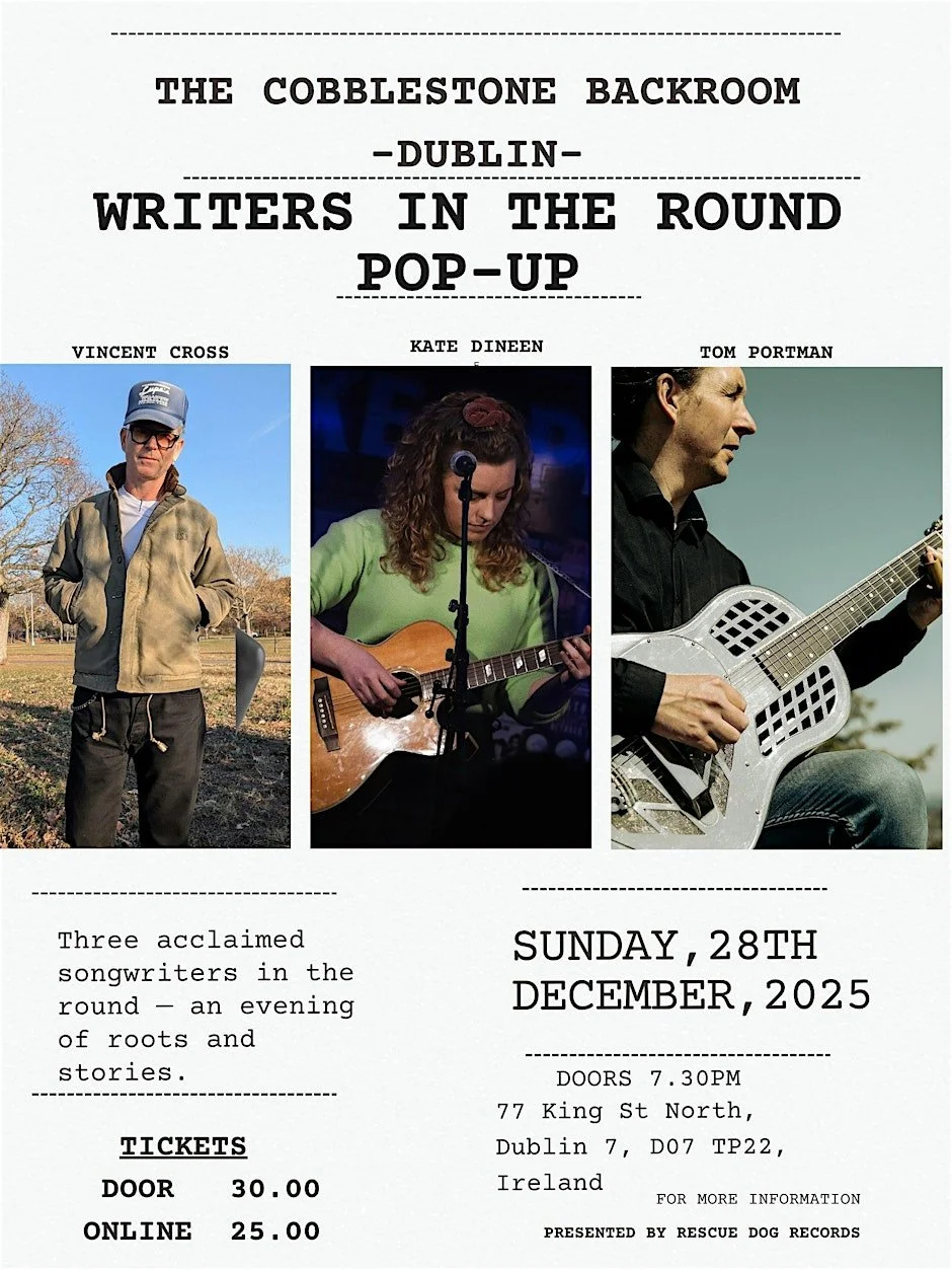 Writers in the Round brings together three acclaimed songwriters — Vincent Cross (USA), Tom Portman(IRE), and Kate Dineen)IRE) — for an intimate evening of songs and stories at The Cobblestone Backroom, Dublin, on Sunday, December 28th.